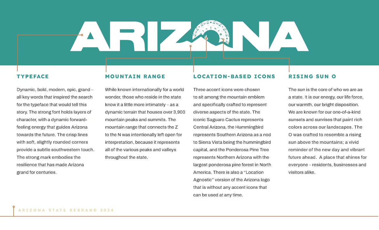 The most recent rebrand was guided by interviews of over 2,000 Arizonans across the state designed to elucidate consistent elements associated with Arizona. The rebrand is supposed to showcase Arizona’s growth and diverse offerings, assisting in growing the state’s tourism economy and its public image.